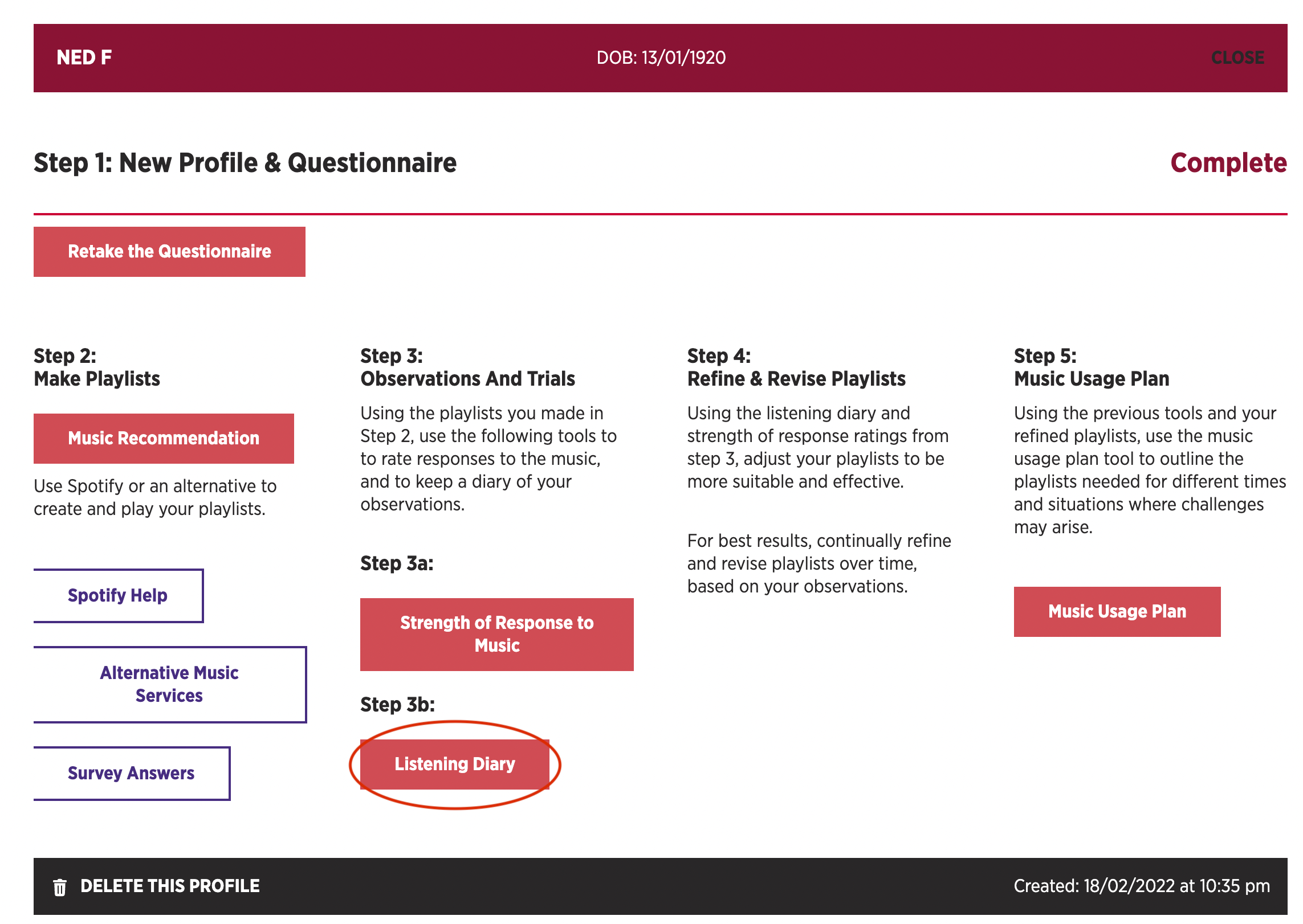 Once the Questionnaire has been completed there will be a link to keep a listening diary for each profile under their name on the ‘My Profiles’ page