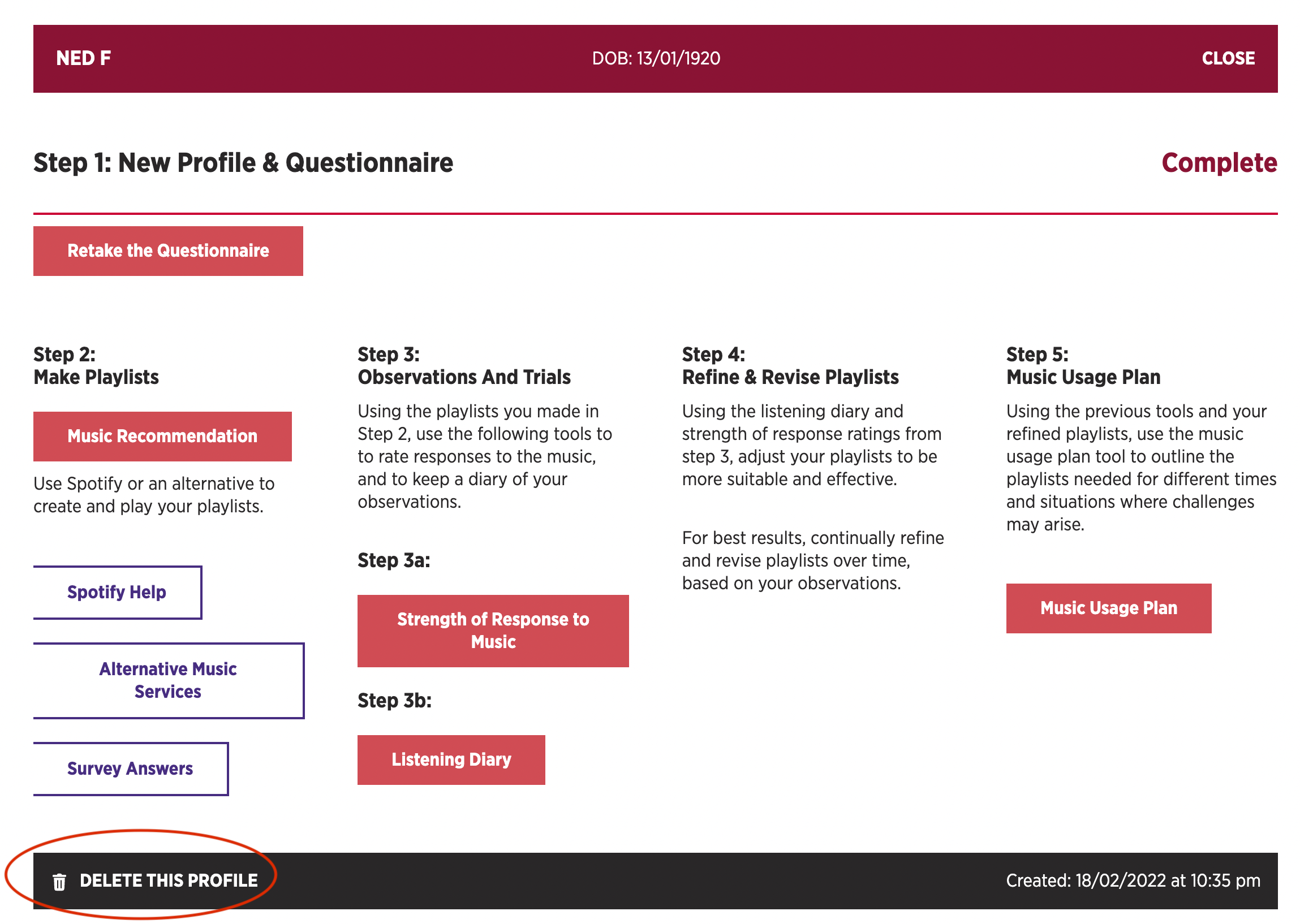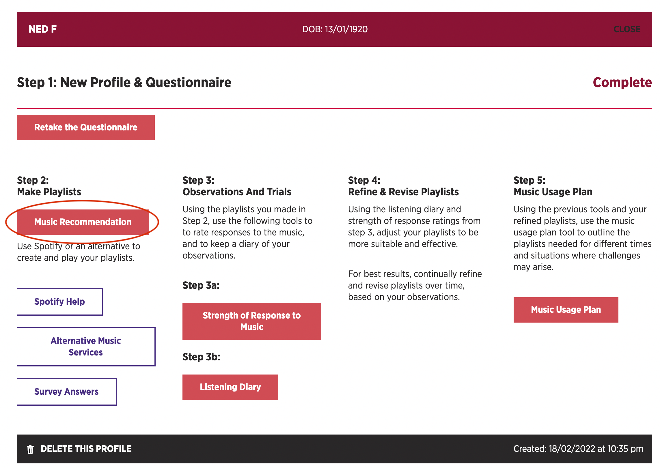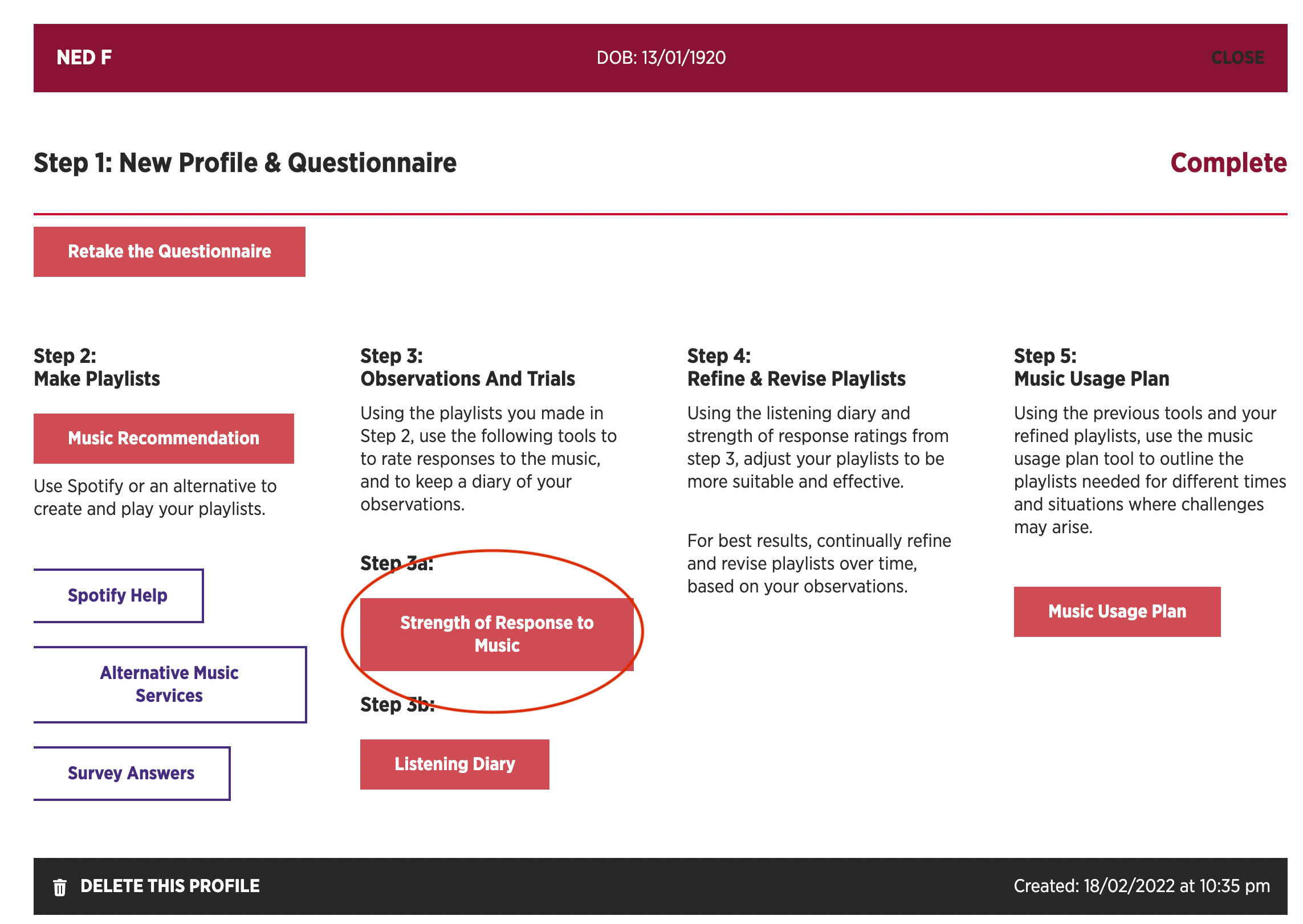 Once the Questionnaire has been completed there will be a link to rate the profile’s responses to music under their name on the ‘My Profiles’ page