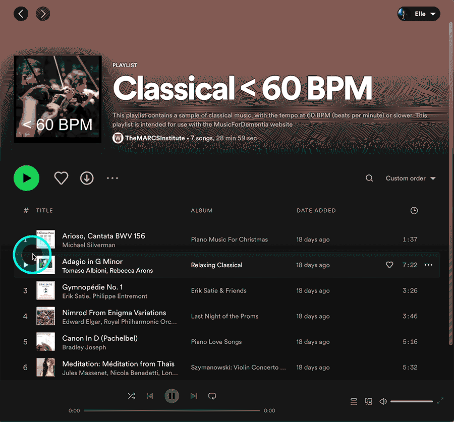 This playlist is intended for example use only and your song selection will to be based on music genre preferences, favourite songs and your observations on reactions to tracks selected.